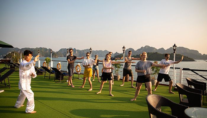 13:00: A splendid lunch is served at the restaurant while cruising into the primitive Lan Ha Bay. The bay has hundreds of small and large islands, making it an enormous, wonderful scene to look at while dining.